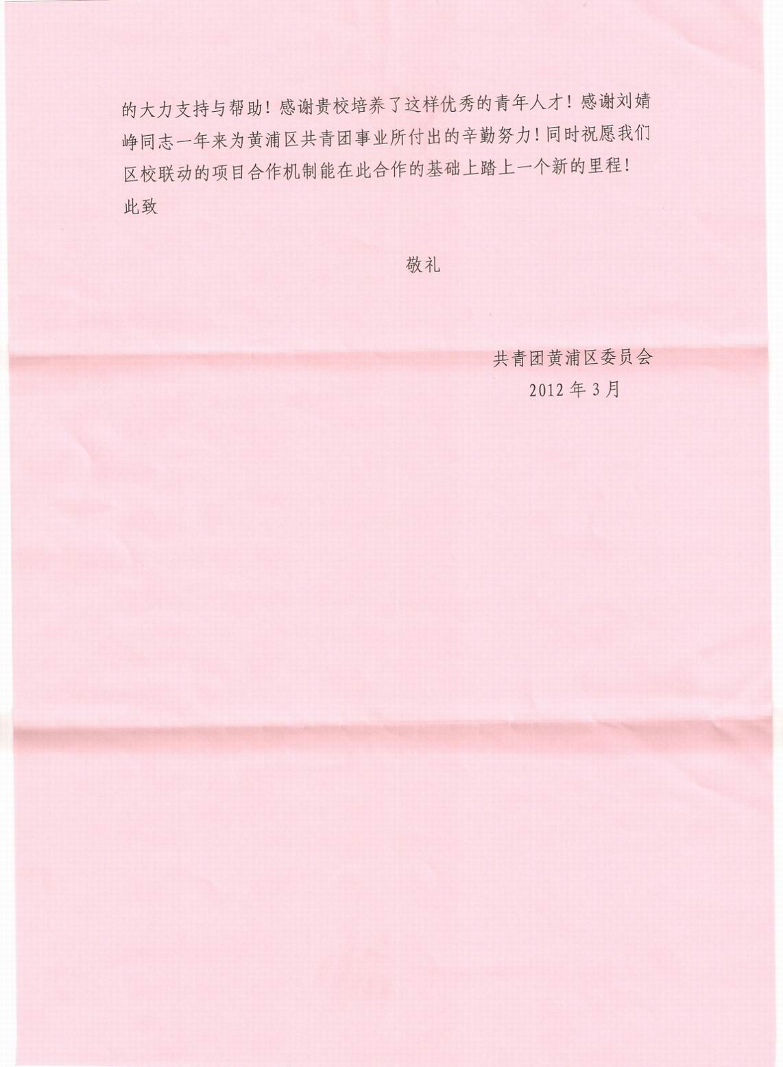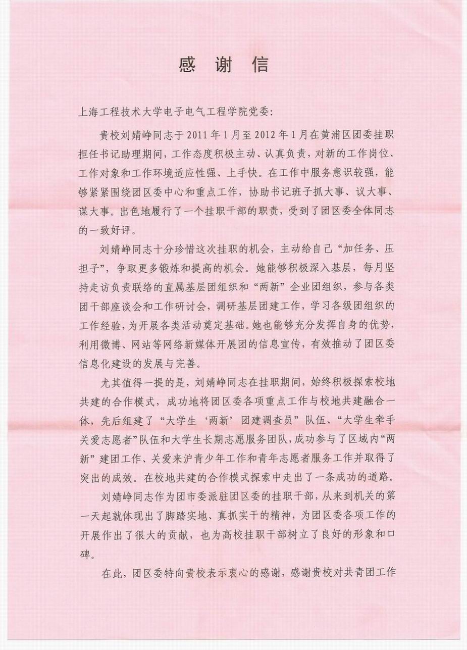 2012年3月,上海工程技术大学电子电气工程学院党委收到共青团黄浦区委员会发来的感谢信,感谢学院刘婧峥老师在2011年1月至2012年1月在黄浦区团委挂职担任书记助理期间所作的工作,为我校培养出这样优秀的青年人才以及其一年来为黄浦区共青团事业所付出的辛勤努力高度肯定,同时也祝愿和期望我校与黄浦区联动的项目合作机制能在此基础上踏上一个新的里程碑。 信中说道,刘婧峥同志工作态度积极主动,认真负责,对新的工作岗位,工作对象和工作环境适应性强,上手快。在工作中服务意识较强,能够紧紧围绕团区委中心和重点工作,协助书记班子抓大事,议大事,谋大事。她出色的履行了一个挂职干部的职责,受到了团区委全体同志的一致好评。刘婧峥老师十分珍惜这次挂职的机会,主动给自己“加任务,压担子”,争取更多的锻炼和提高的机会。她从来到机关的第一天起就体现出脚踏实地和真抓实干的精神,为团区委各项工作的开展做出了很大的贡献。尤其值得一提的是,刘婧峥老师在挂职期间,始终积极探索校地共建的合作模式,成功的将团区委各项重点工作与校地共建融合一体,先后组建了“大学生‘两新’团建调查员”队伍,“大学生牵手关爱志愿者”队伍和大学生长期志愿服务团队,成功参与了区域内“两新”建团工作,关爱来沪青少年工作和青年志愿者服务工作并取得了突出的成效。在校地共建的合作模式探索中走出了一条成功的道路。 最后,共青团黄浦区委员会希望我校与其不断完善区校联动的项目合作机制,并期望在此基础上可以踏上一个新的里程。 |
