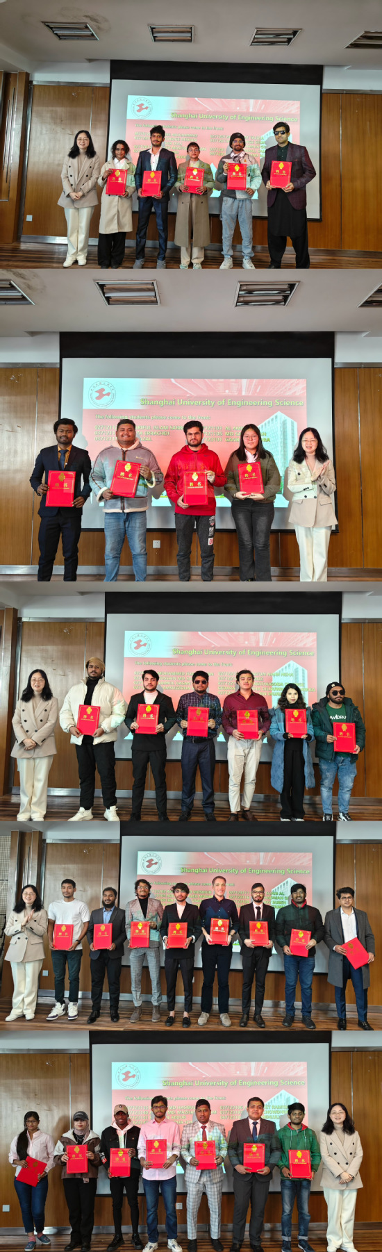 王勤院长向此次受聘为上海工程技术大学国际学生招生宣传大使的同学们表示热烈祝贺和诚挚感谢。她寄语同学们,聘任国际学生宣传大使、吸引更多优质生源是我校积极响应“教育国际化”号召的有力措施,学校将创造更多元的国际化氛围,为学生创造更广阔的交流平台,同时也鼓励同学们通过招生宣传大使服务经历,收获一段难得的人生体验。李跃文副院长表示,期待在同学们的共同努力下,为我校国际化氛围的营造和国际化人才的培养增添新的活力。在全体师生的见证下,王勤院长为国际学生大使颁发了聘书,大四学生木兰(Zannat Tajqia) 同学作为国际学生招生宣传大使代表,分享了自己四年来作为招生宣传大使的经验和体会,并号召同学们一起把在我校的学习和生活经历向世界各地的同龄人分享,展现我校风采。