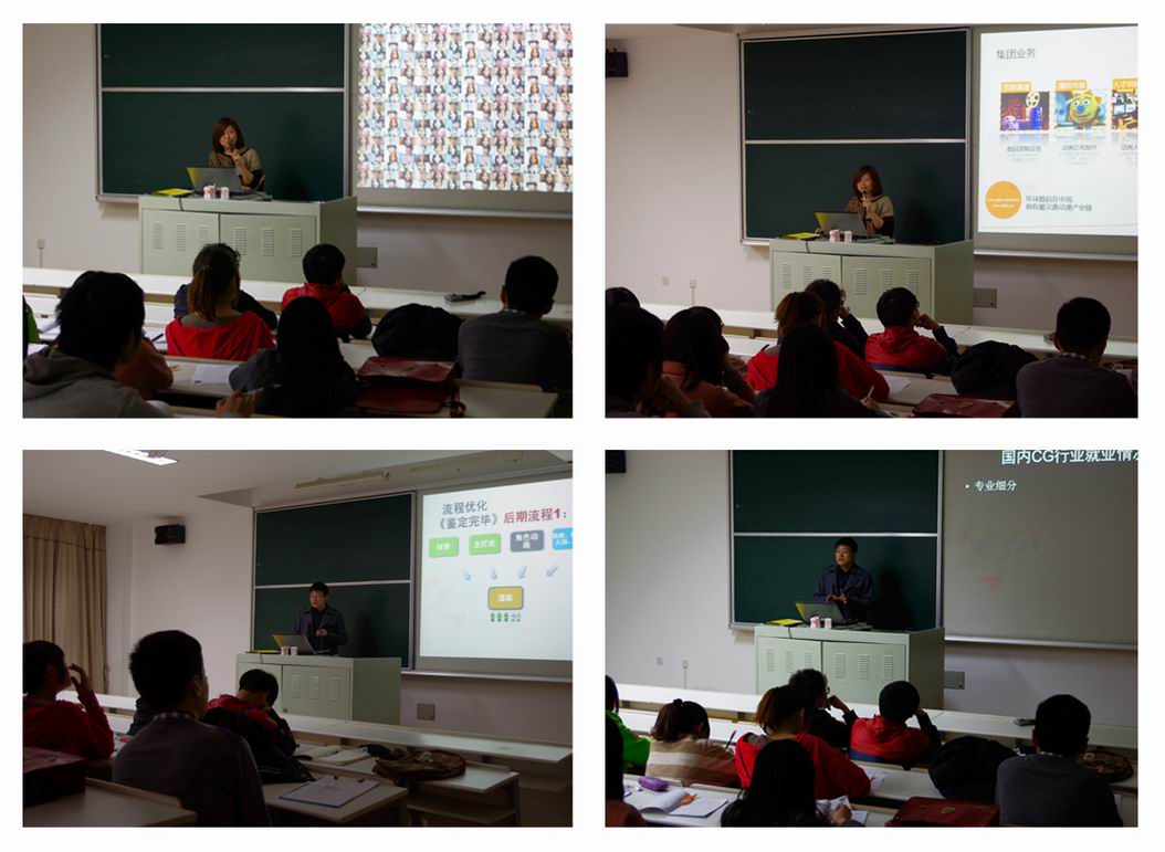 接着刘威老师讲解了这个行业中的职业细分。通过产业案例和技术短片的播放,同学都对媒体行业有了直观的了解。讲座的最后,环球数码的两位老师还邀请同学们参加他们公司的讲座交流。