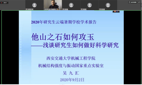9月2日上午,西安交通大学吴九汇教授在华为云会议平台为“新能源汽车学科创新人才培养”研究生暑期学校学员作题为《他山之石如何攻玉——浅谈研究生如何做好科学研究》的线上专题讲座。此次讲座由机械与汽车工程学院副院长崔国华教授主持,257名暑期学校学员在线聆听讲座。