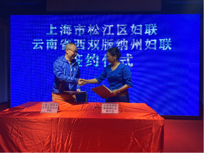 8月24号,松江区妇联与西双版纳州妇联签约仪式在西双版纳州聚匠非遗文化交流传播中心举行,双方就对口扶贫协作工作情况及今后帮扶协作意向进行了深入交流和探讨,签订了《云南西双版纳文化创意产品合作协议》。艺术设计学院党委副书记、院长高瞩教授作为高校代表与云南省西双版纳州妇女联合会共同签署了《关于“松江—西双版纳”地校合作意向书》。两项协议的签署旨在促进文化创意产业的开发和创新,助力女性创新创业,丰富扶贫协作举措,更好地促进云南当地文化创业产业深度开发和创新,服务当地经济社会生活。