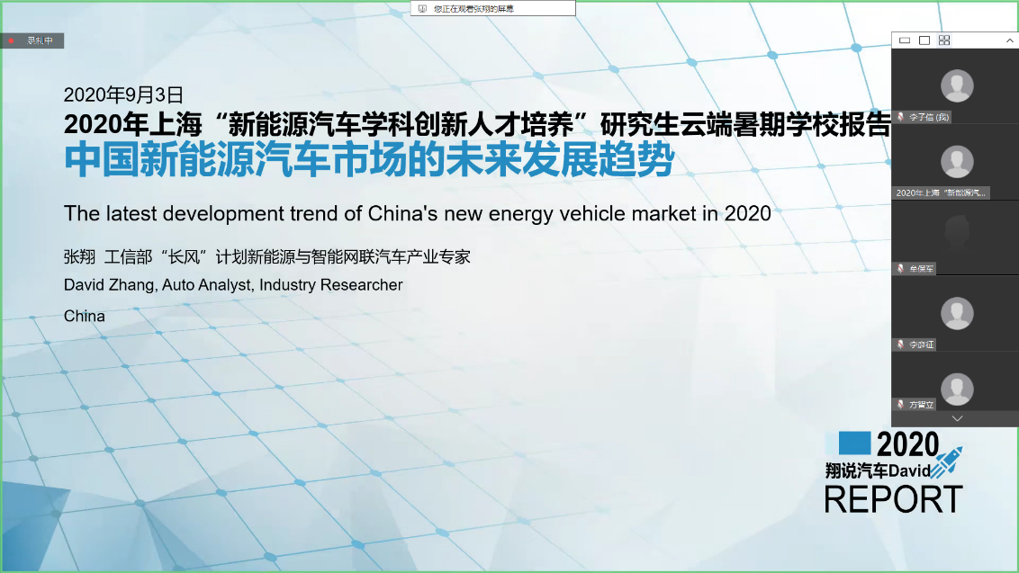 9月4日上午,张翔研究员在华为云会议平台为“新能源汽车学科创新人才培养”研究生暑期学校学员作题为《中国新能源汽车市场的未来发展趋势》的线上专题讲座。此次讲座由机械与汽车工程学院刘新田副教授主持,257名暑期学校学员在线聆听讲座。