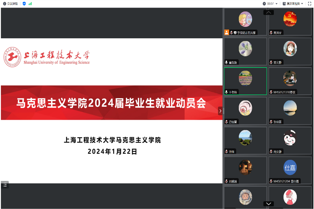 1月22日下午,马克思主义学院在线召开2024届毕业生就业动员会。学院党委书记董旖旎、院长刘志欣、副院长于凯、辅导员郑文静、全体2024届毕业生参加会议。动员会由辅导员郑文静主持。