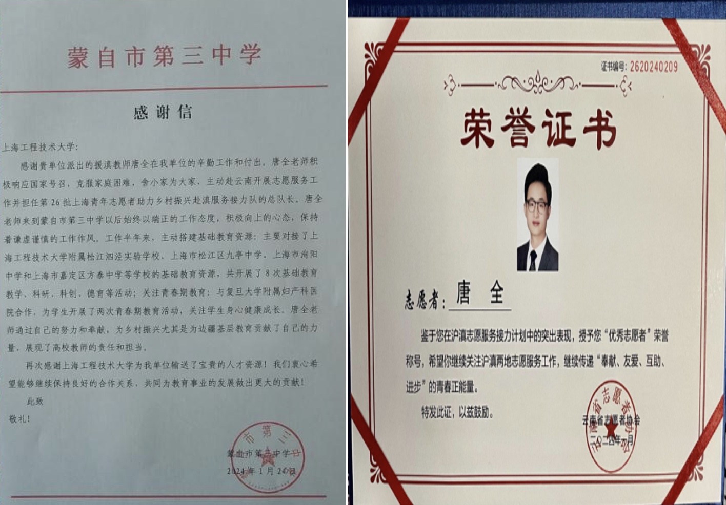 为了感谢唐全老师的付出和贡献,中共蚌峨乡委员会、蚌峨乡人民政府向我校赠送“沪滇情深谊更长,大爱无疆暖心间”锦旗,西双版纳州勐海县勐阿镇人民政府向我校赠送“沪滇志愿服务献真情,助力乡村振兴暖边疆”锦旗,蒙自市第三中学向学校发来感谢信。唐全老师个人荣获云南省“优秀志愿者”荣誉称号。