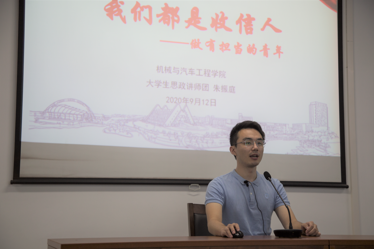 为深入学习贯彻习近平总书记给北京大学援鄂医疗队“90后”党员、复旦大学青年师生党员、中国石油大学(北京)克拉玛依校区毕业生的重要回信精神,9月12日,机械与汽车工程学院大学生思政讲师团在线上开展“我们都是收信人”主题宣讲,来自机械工程专业的朱振庭宣讲的题目是“做有担当的青年”。
