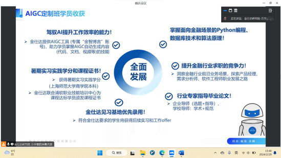 紧扣AI发展前沿,校企合作培养创新人才。数理与统计学院与上海金仕达软件科技股份有限公司、华东理工大学、上海师范大学四方联合推出“1+3”校企AIGC定制班,进一步加强校企合作、校校合作,通过实景演练、企业实操等方式加强学生AI教育。2月29日下午,数理与统计学院首届校企AIGC定制班宣讲会通过腾讯会议线上召开,学院学工组长史佳琪老师,大三及研二的同学参加宣讲会。上海金仕达软件科技股份有限公司金仕达研究院院长助理万宇雷进行课程宣讲。
