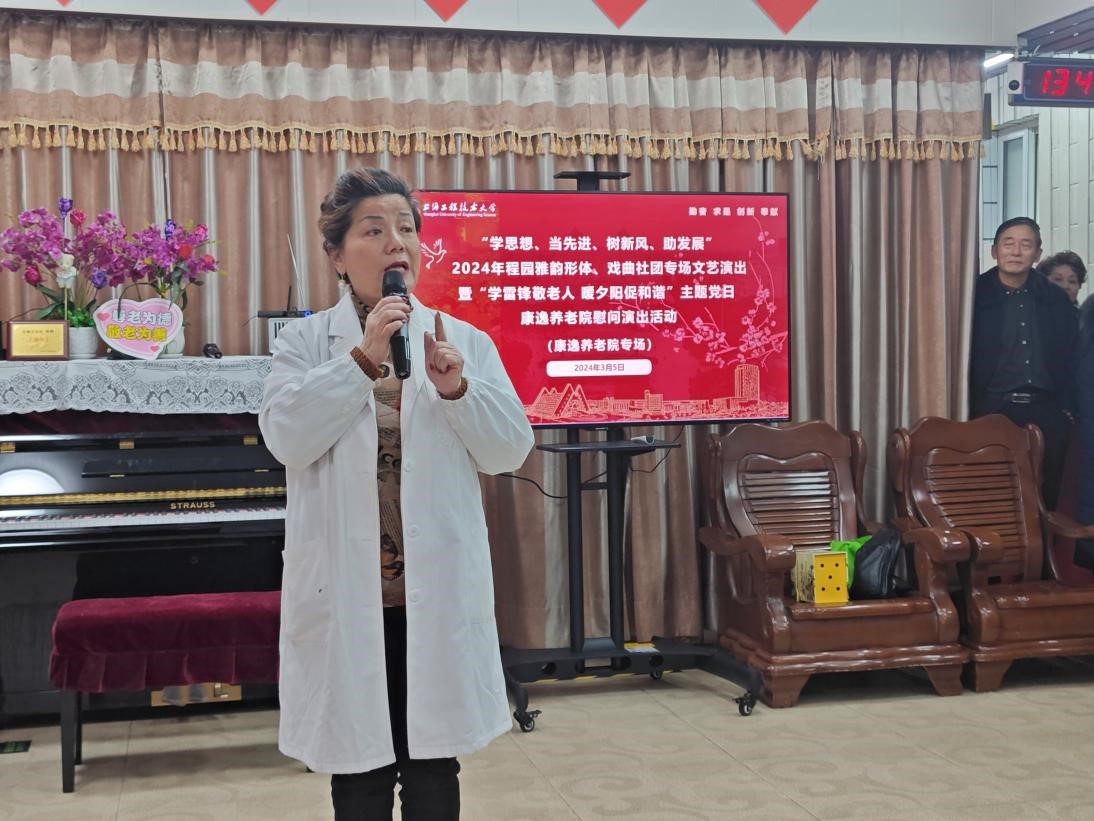 文艺演出暖人心,敬老院里笑声传。3月5日下午,为大力弘扬雷锋精神,丰富老人们的精神文化生活,传承中华民族敬老、尊老、爱老的传统美德,校退休工作处党支部,退休教工程韵形体、戏曲社团前往上海康逸养老院举办“学思想、当先进、树新风、助发展”2024年程园雅韵“学雷锋敬老人 暖夕阳促和谐”专场文艺演出,以此迎接第61个全国学雷锋纪念日。党委离退休工作部副部长、退休工作处党支部书记张漪,上海康逸养老院院长、原我校工会退休职工戴琼出席活动。程韵形体社团步文捷老师主持活动。