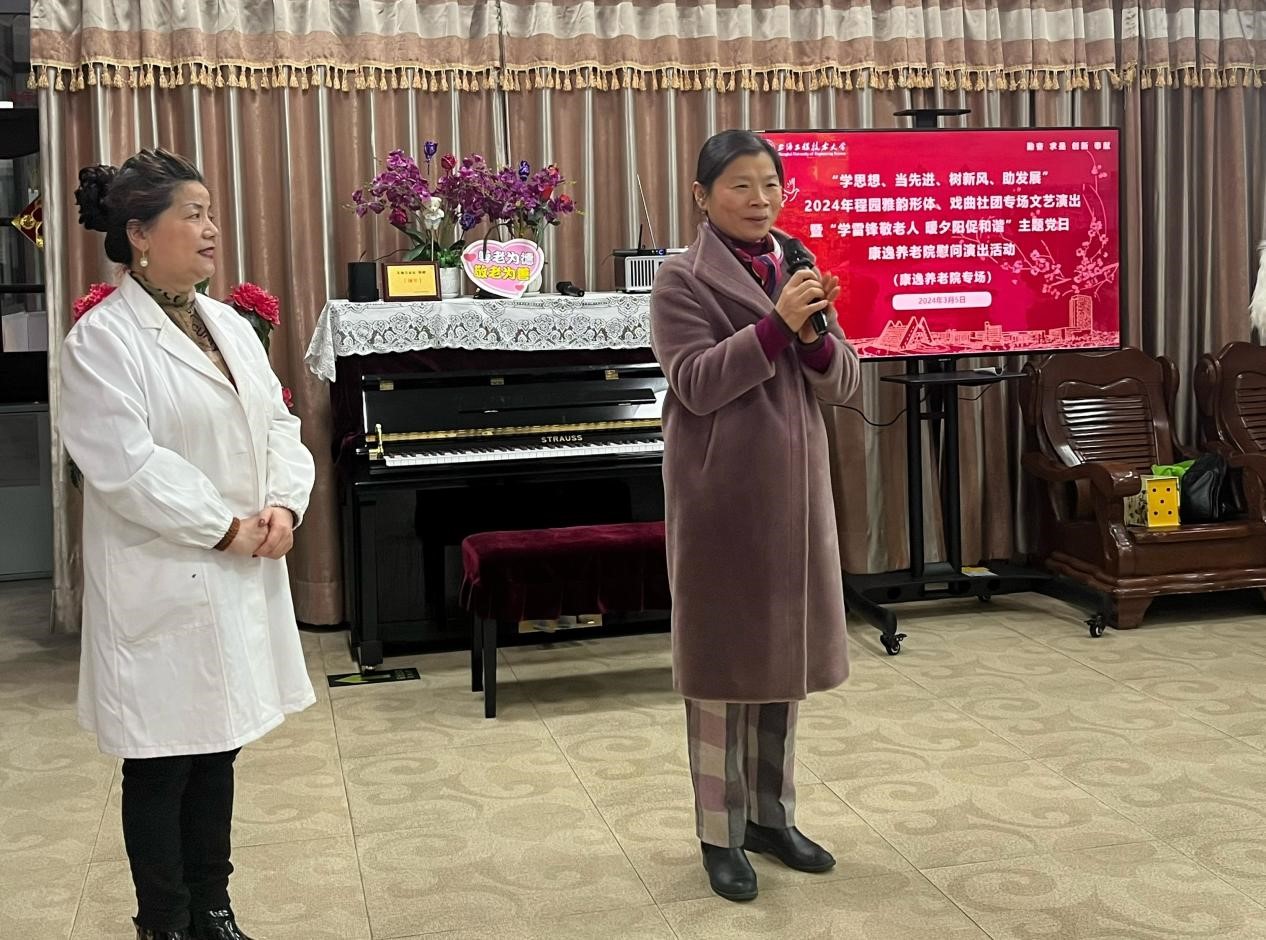 戴琼感谢学校长期以来关心、帮助着每一位退休教职工,感谢学校每逢敬老节都会电话邀请她“回娘家”,作为一名上海工程技术大学的退休职工是幸福的、自豪的。今天能见到那么多曾经的同事、好友前来探望,以“学雷锋敬老人,暖夕阳促和谐”的主题为养老院准备精彩的演出,更让她感到由心的温暖。她代表康逸养老院表示热烈的欢迎和衷心的感谢。