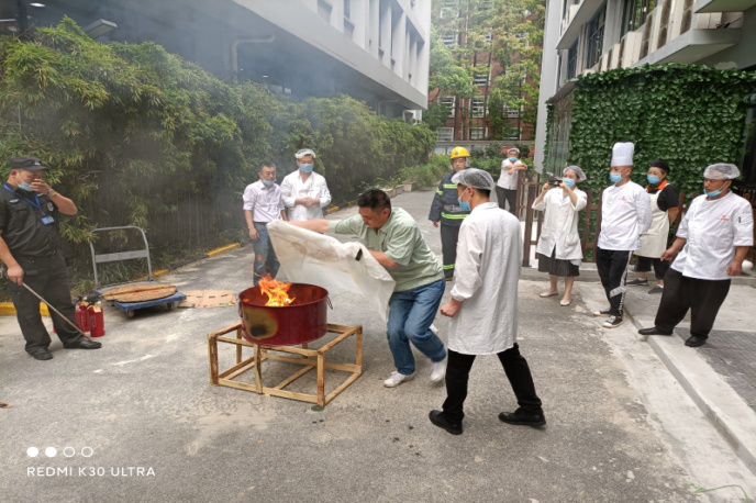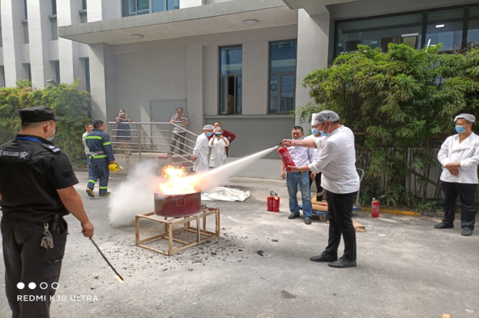 后勤保障服务中心主任陈宇宏认真组织餐饮公司全体员工参加本次培训。保卫科领导亲自在现场教学和演示。副科长金坚结合本次演习,对食堂提出了增加各开关的标识标贴、实地体验各操作位置等要求。保安队长郝玉刚讲授了“1提2拔3握4对5喷”的灭火方法,反复讲解灭火毯的使用、灭火器的操作流程,一一进行了操作示范,指导餐饮人员一一进行了实地操作。