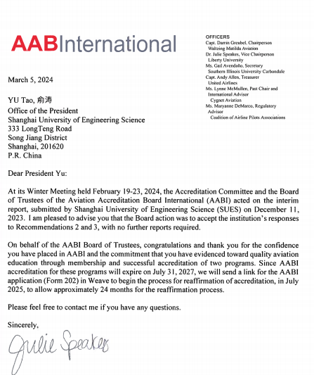航空运输学院(飞行学院)交通管理专业、飞行器制造工程专业于2022年7月15日正式通过国际航空专业认证以来,紧扣专业认证标准及要求,广泛与企业行业、兄弟院校专家论证研讨持续改进方案,一年多来就课程体系建设、实验室安全管理机制建设以及产教融合专业建设等多方面进行综合改革。学院于2023年12月11日向国际航空认证委员会(AABI, Aviation Accreditation Board International)提交专业认证中期报告,从持续改进实施办法、路径、举措等多方面总结阐述了专业建设及人才培养的优化改进做法及成效,近日,学院收到专业认证中期报告通过确认函,获得AABI认证委员会的高度认可。