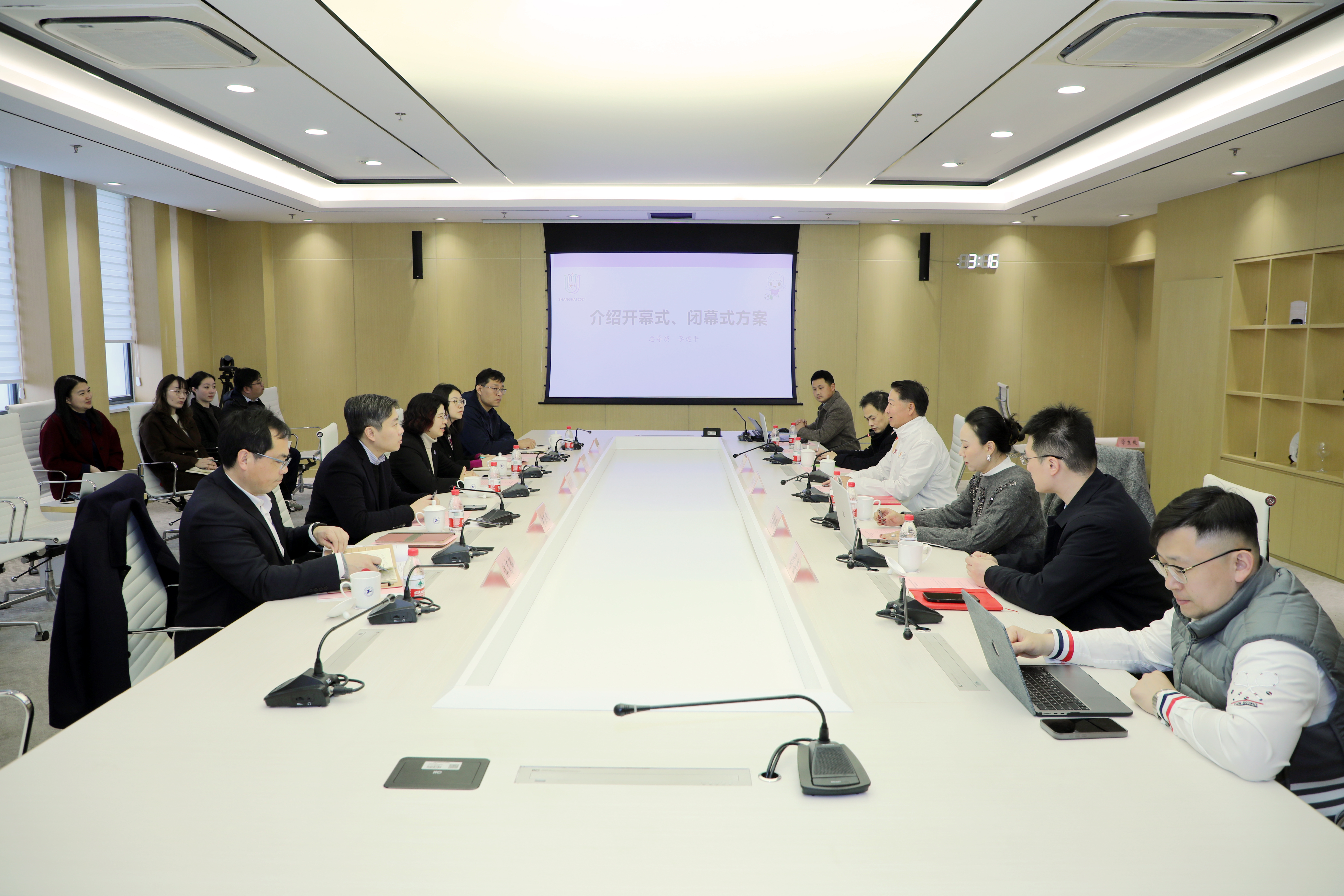 李建平总导演对赛事组委会给予的信任和热情表达感谢,对学校赛事组委会在筹备过程中所付出的巨大努力给予了充分的肯定和赞扬。表示导演团队将根据国际大学生体育联合会、学校赛事组委会的要求,和各部门团结一心、全力以赴,有序推进、信心满满,努力办出创意、办出精彩、办出特色!他详细阐述了本届赛事的开、闭幕式方案,与会各部门就方案实施、推进的细节事项进行了充分交流和研讨。