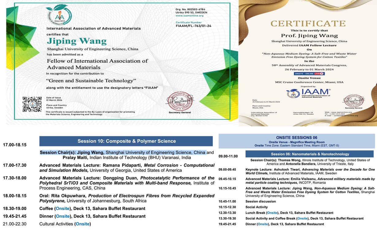 近日,纺织服装学院教授、上海纺织化学清洁生产工程技术研究中心主任王际平当选国际先进材料协会(International Association of Advanced Materials,IAAM)会士(FIAAM),以表彰其在“绿色和可持续发展技术”领域做出的突出贡献。王际平教授受邀参加了在美国迈阿密举行的第58届先进材料大会(American Advanced Materials Congress),并担任复合和聚合物材料科学分会场主席,作了“Non-Aqueous Medium Dyeing: A Salt- Free and Waste Water Emission Free Dyeing System for Cotton Textiles”主题报告,着重介绍了研究团队在纺织品绿色可持续发展和无盐非水介质染色技术方面的系统工作。