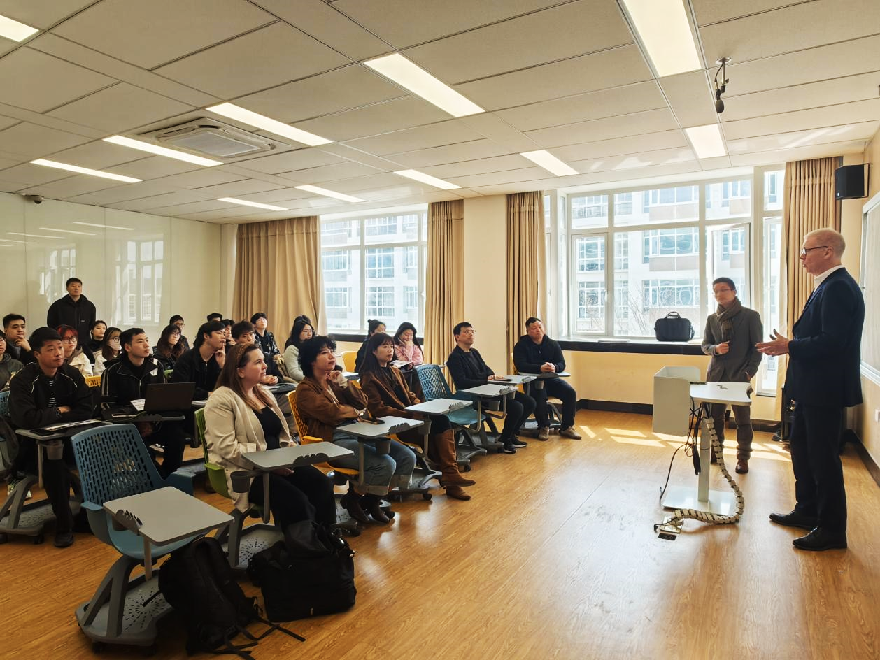 Cameron Wilson在教学楼D319为艺术设计学院学生进行了精彩的海外留学宣讲,他主要从学校定位、国际排名、专业设置等多个方面介绍了英国邓迪大学艺术设计学院基本情况,并向同学们分享了留学英国邓迪大学的优势。