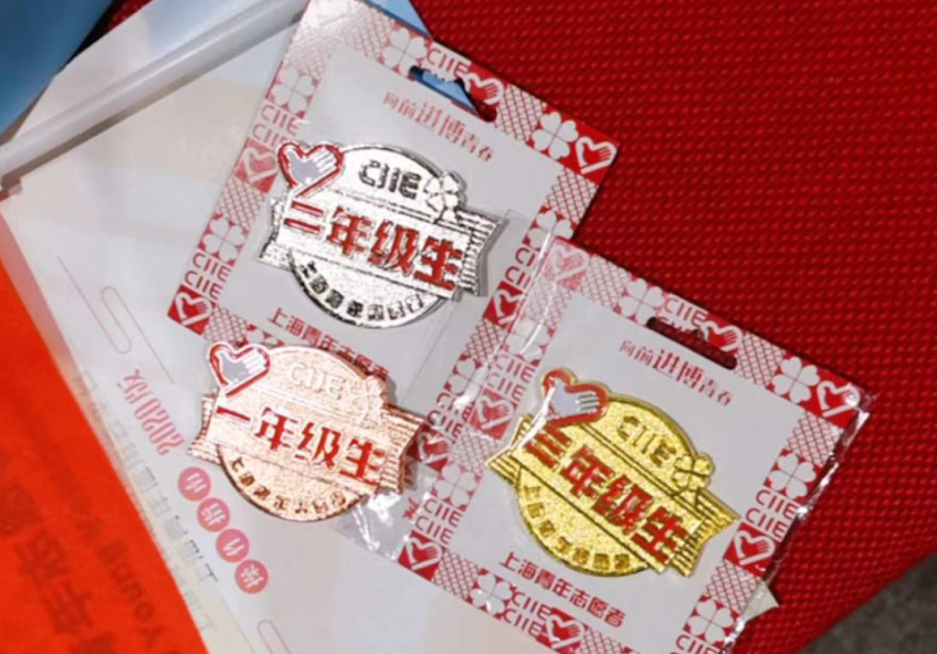 宣誓仪式现场,第一年服务进博会的“小叶子”们戴上了铜色徽章,连续参加两届或三届进博会志愿服务的“二年级生”和“三年级生”则分别收获了银色和金色徽章。来看看这些“一年级”“二年级”“三年级”程园“小叶子”在宣誓仪式后的感受吧!
