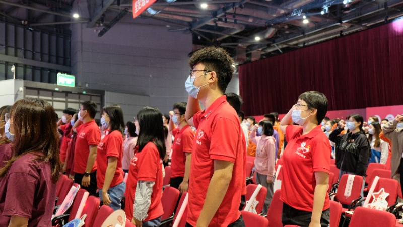 10月18日上午10时,在国家会展中心(上海)虹馆,由6位曾在疫情期间担任防疫志愿者的“小叶子”领誓,近500名第三届中国国际进口博览会志愿者与线上4300余名伙伴共同庄严宣誓“向前进,博青春!为进博,一起来!”