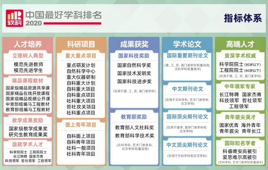 软科排名的指标体系包括人才培养、科研项目、成果获奖、学术论文、高端人才五个指标类别,下设16个指标维度,共有50余项反映学科竞争力的客观量化指标。排名数据全部来自第三方数据源,如教育部、科技部、国家自然科学基金委员会、国际和国内文献数据库等。不同学科的学科点基数不同,因此竞争的激烈程度也各不相同。为此,中国最好学科排名从首次发布起就引入了百分位段的概念,在绝对数排名以外还给出了每个学科点在本学科所处的相对位置。从上榜学科数量分布来看,均显示了不同的实力,其中北京列全国第一,上海第二,江苏第三。