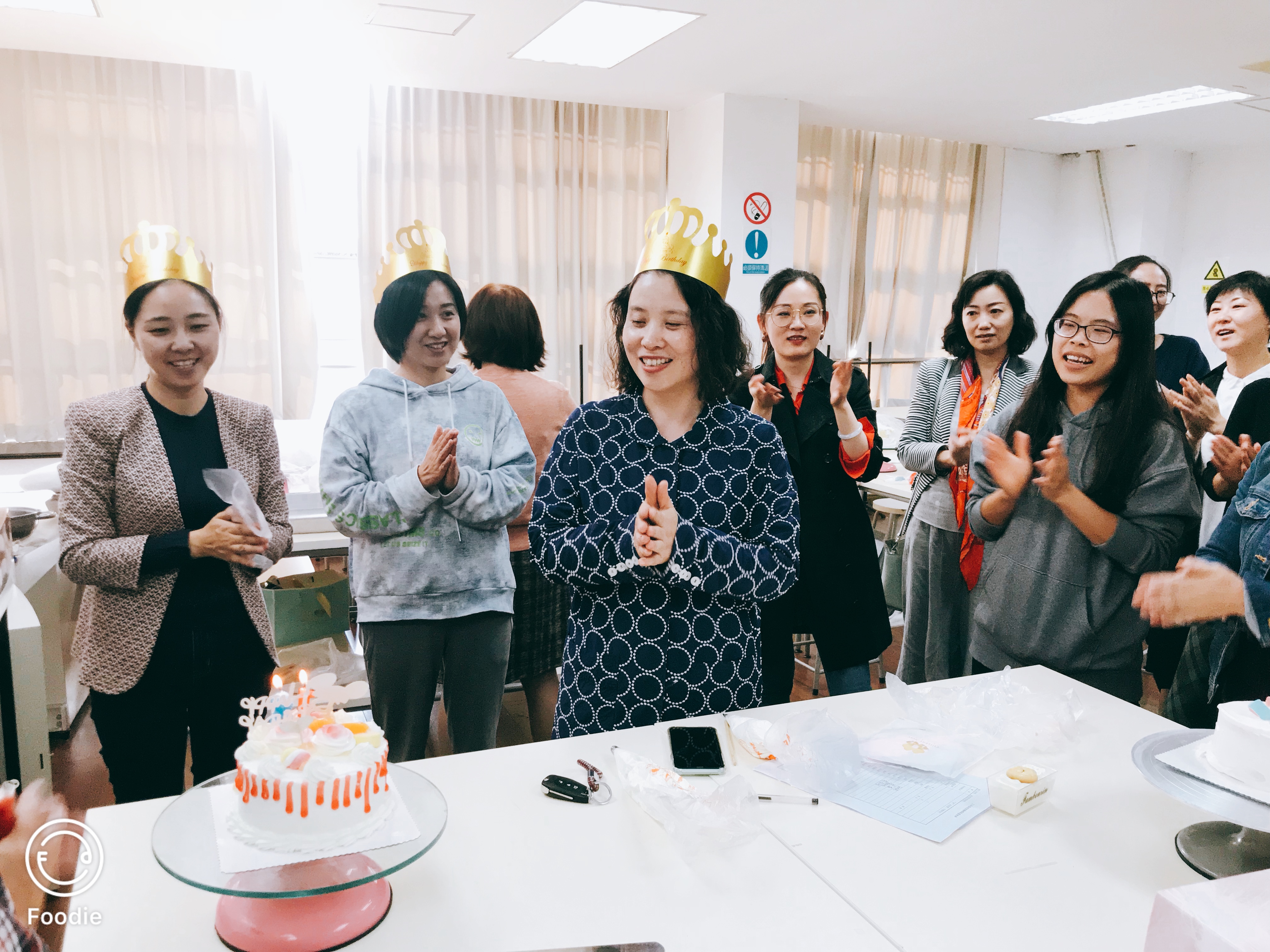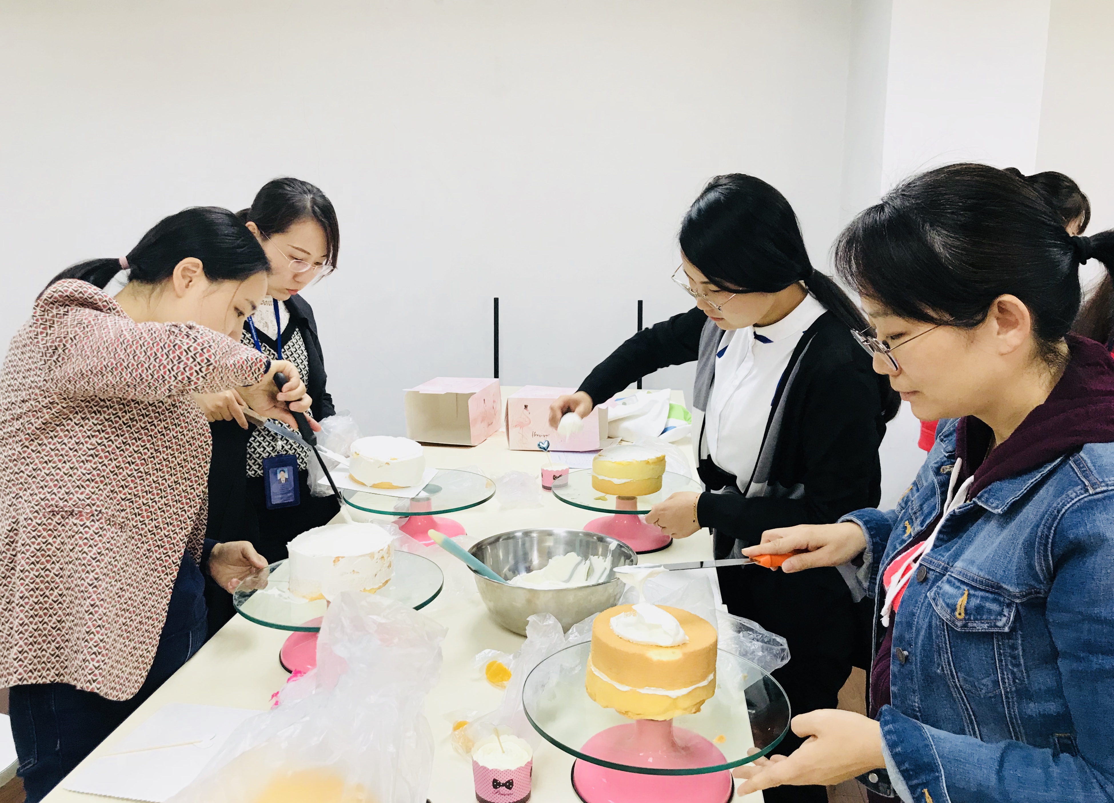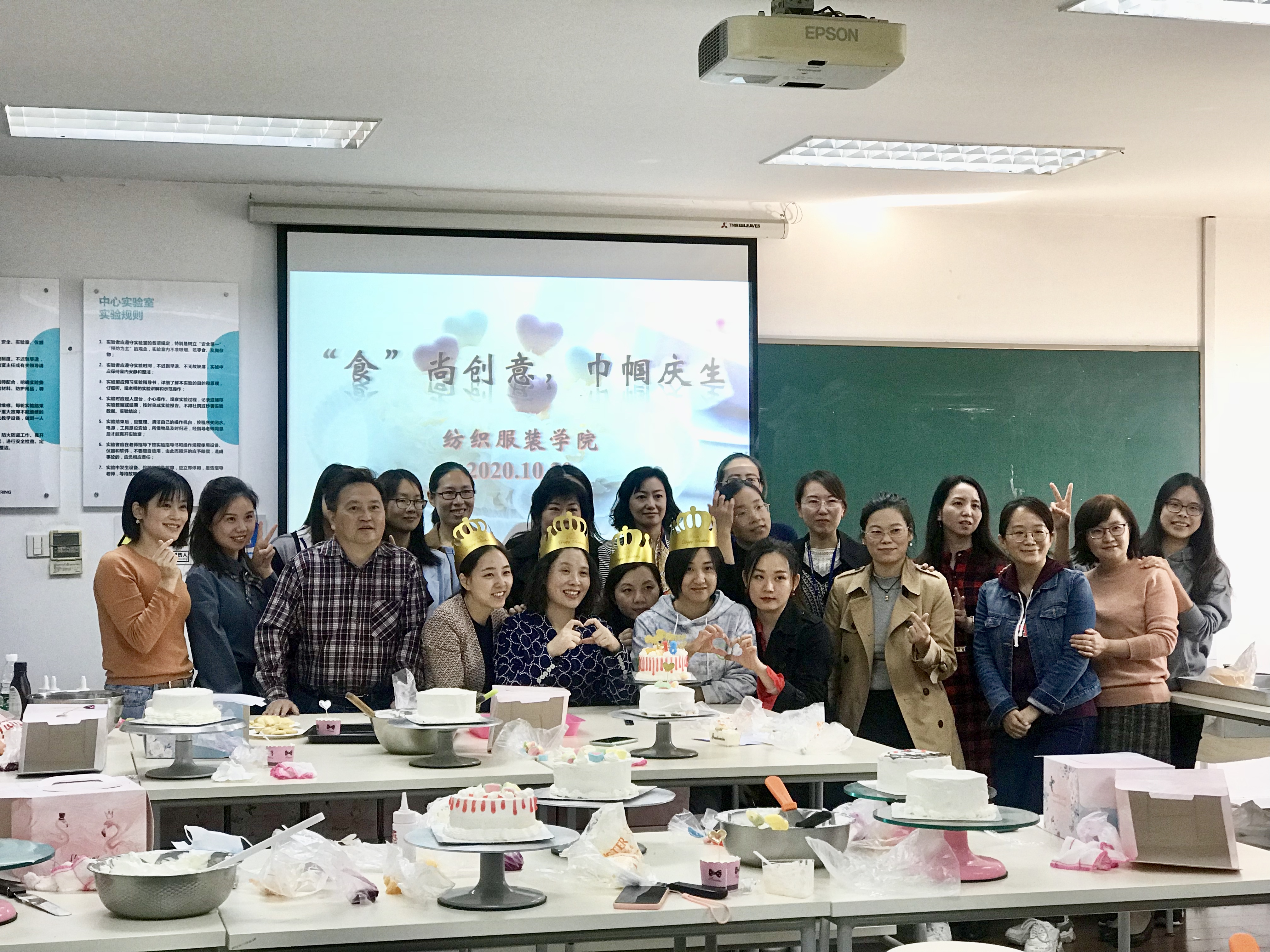 本次活动由纺织服装学院工会主席王黎明老师主持,学院的工会委员、女教师们共同参加了本次活动,活动邀请了两位专业的西点老师,通过制作讲解,使老师们了解了手工做蛋糕的重点难点,以及需要注意的事项,并通过示范实践操作了手工奶油蛋糕的制作过程。此次活动的举办恰逢几位老师的生日,大家一起为寿星老师们献上特意制作的蛋糕并一起唱生日歌,献上生日祝福。