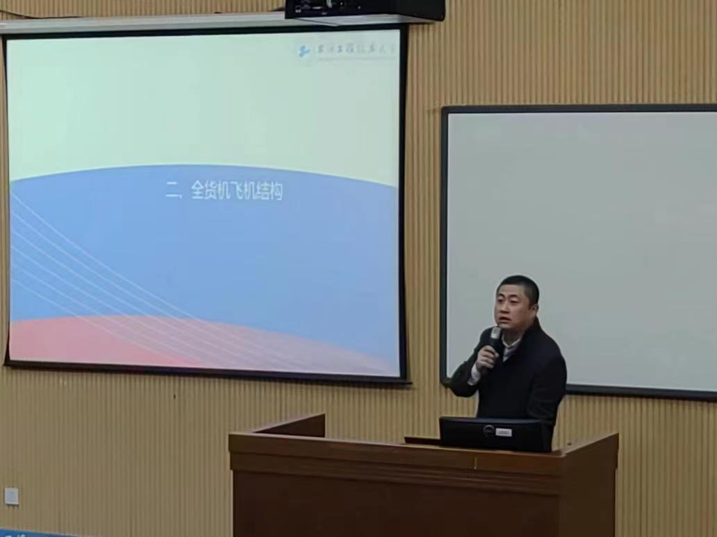 周华军从全货机飞机结构、机坪装载作业、库区仓储三个方面详细介绍了航空货运的相关理论知识和一线实践操作。以做一名合格航空人,培养专业精神为总结,勉励同学们树立“航空报国”志向,提高民航职业道德,努力学习,积极上进,报效祖国。