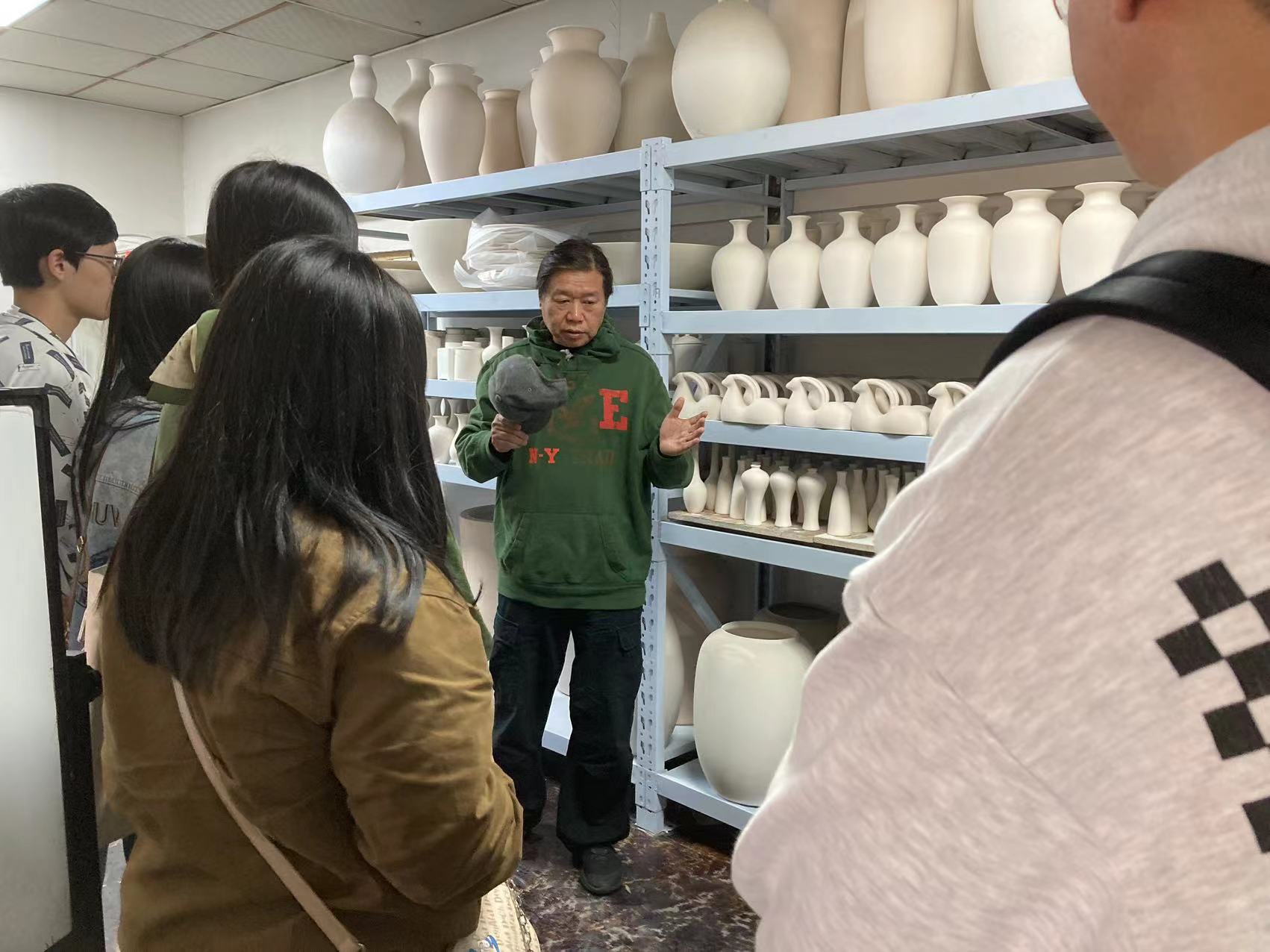 4月6日,国际创意设计学院“申韵东窑——海派瓷艺人才工作室 东瓷文创工作坊”的师生一行来到位于江桥镇的上海秦古美术馆研学。学生们深入园区和工艺现场,了解陶瓷艺术的技艺和制作过程,并向美术馆的陶艺大师、烧制师傅学习陶瓷艺术的创新、发展以及制作流程。陶艺馆的工作人员为学生们介绍了展馆现有作品、近期展项以及陶瓷艺术的创意过程及瓷画烧制的精细要求。驻馆艺术家平龙老师为学生们详细介绍了瓷艺创作中的美学特征和材质要求,重点介绍了海派绘画与陶艺的关联以及未来海派陶艺的发展。
