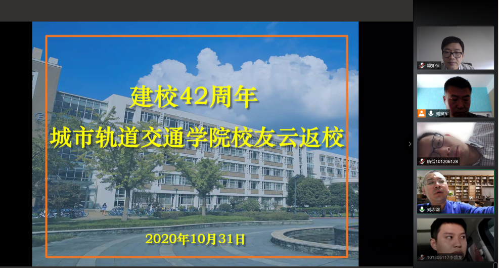 10月31日,建校42周年校友返校日之际,城市轨道交通学院举行了“众志成‘程’”——我为母校建言献策毕业10周年校友“云”返校座谈会。城市轨道交通学院党委副书记、院长刘志钢,党委副书记盛知恒,毕业10周年校友代表、师生代表近百人参加了“云”返校活动。座谈会由学生办公室辅导员刘景军老师主持。