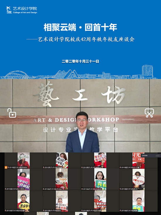 艺术设计学院校友在云聚会中统一展示了创意手牌,向母校表达了诚挚的问候。