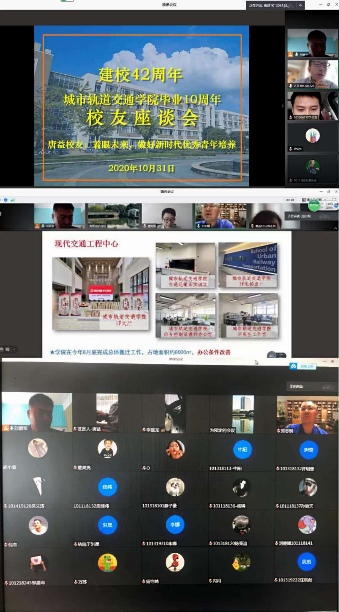 本次校友返校日首次以线上座谈为形式,以班级、专业或年级为单位组织开展。管理学院、化学化工学院、材料工程学院、艺术设计学院、航空运输学院(飞行学院)、纺织服装学院、城市轨道交通学院、中韩多媒体设计学院的11位院领导分别出席了本学院的云聚会,向与会校友表达热烈欢迎和亲切问候。