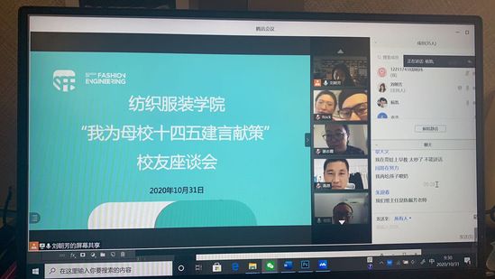 纺织服装学院等8个学院开展了建言献策座谈会。校友们以母校“十四五”规划为主题畅所欲言,围绕产学研合作、国际化发展、人才培养机制、校园环境和文化建设等方面贡献了自己的智计。