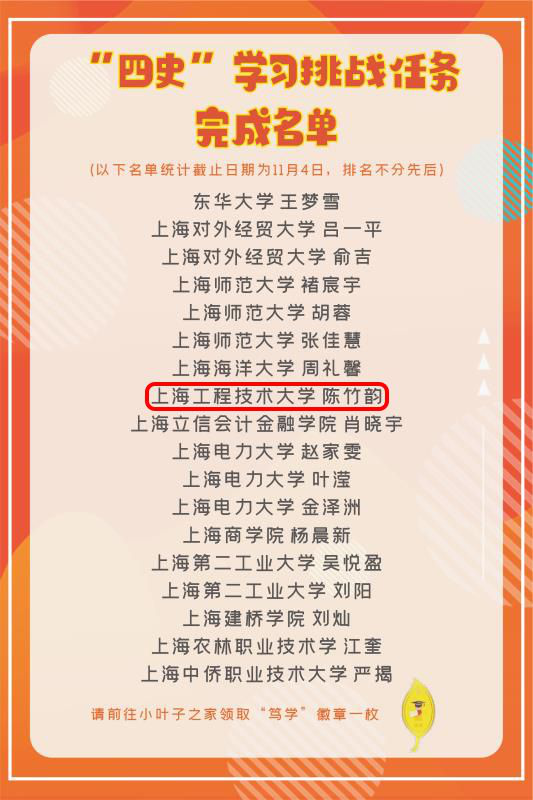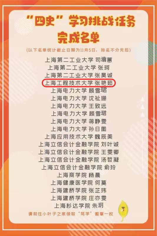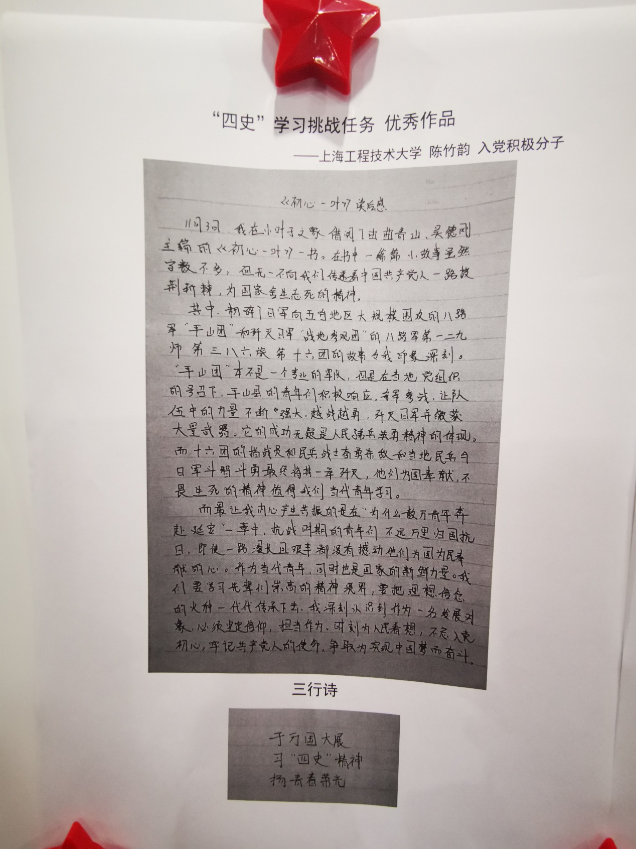 学“四史”,迎进博!学习“四史”书记,撰写读书笔记;围绕“四史”学习,编写三行诗,抒发家国情怀和青年使命担当。来自工程大三名“小叶子”——尹振伟、陈竹韵和张艳如率先完成“四史”挑战,其中尹振伟、陈竹韵提交的“四史”学习优秀作品被张贴在“信仰大厅”展示。