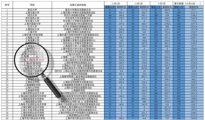 自10月中旬起,工程大“小叶子”分批进馆,参与防疫时期进博会咨询演练。此次工程大“小叶子”的志愿者岗位为咨询处,从27日起每日早上7点进场,足迹丈量国展中心,熟悉每一个点位,更好地在服务来宾们。作为每天第一批迎着曙光中外来宾者和最后一批目送观众的志愿者,每天志愿者时长都超11小时,截止至11月4号志愿者总时长小时数便达到4880+小时,总时长榜位居全市高校前三。