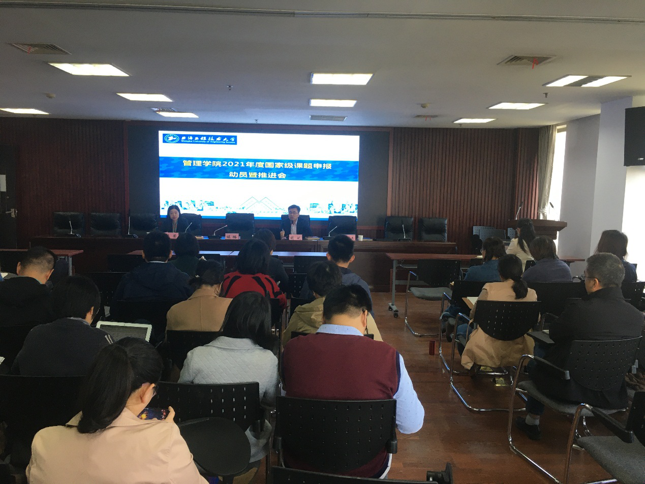 11月11日上午,管理学院2021国家级项目申报推进会在行政楼906会议室举行。管理学院院长胡斌、科研处副处长陈萦、管理学院副院长夏志杰以及学院拟申报教师参加了本次推进会,会议同时邀请上海大学镇璐教授作辅导讲座,会议由副院长夏志杰教授主持。