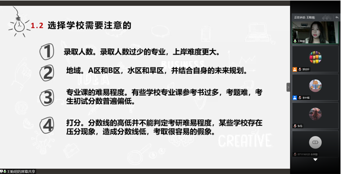 本次分享会是对半个月前的研究生第七和第八党支部线下交流会的一次补充,弥补了此前未参与线下交流会的同学的遗憾,也是对“后疫情时代”交流新模式的探索。研究生第七和第八党支部考研引领活动作为本支部品牌活动,努力做好品牌、品质,不断增强党员同志们为同学们服务的意识,并共同促进学院的学风建设。