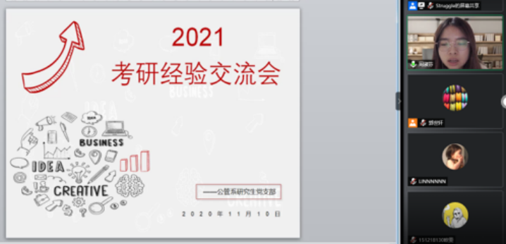 11月10日,管理学院研究生第七和第八党支部在腾讯会议上举办了考研经验交流会,20级公管系研究生李晓天、邬庆超、索梦慧、张媛媛和王贻瑄,通过倾囊相授自己的考研经验,为备考本科生奉上了一次交流盛宴。出席本次交流会的有公管系研究生辅导员周淑芬、20级公管系研究生和大三大四考研同学,活动由20级公管系研究生李中钺主持。