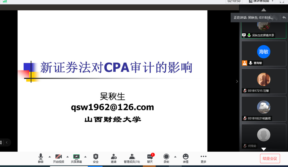 2020年11月12日下午,为提高管理学院全体师生道德建设和科学研究,管理学院曹海敏教授特邀山西财经大学吴秋生教授于线上开展“新《证券法》对CPA审计的影响”的主题讲座。
