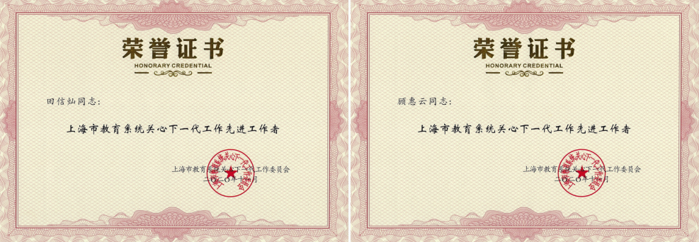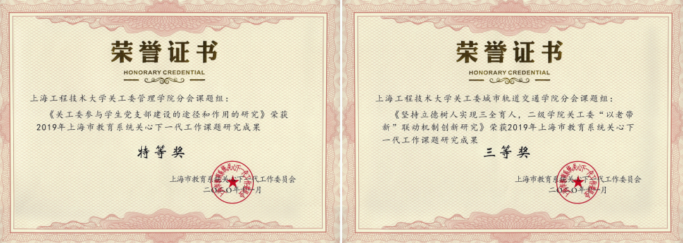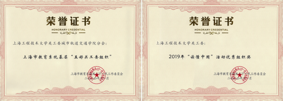 11月10日,庆祝上海市教育系统关工委成立25周年大会暨教育系统关心下一代工作推进会在上海科学会堂举行。本次大会对先进集体和个人进行了表彰。我校关工委获上海市教育系统关心下一代工作先进集体称号;我校城市轨道交通学院关工委分会获上海市教育系统基层“五好”关工委组织称号;校关工委荣获2019年“读懂中国”活动优秀组织奖;管理学院关工委课题组获2019年上海市教育系统关心下一代工作课题研究成果特等奖;城市轨道交通学院关工委分会课题组荣获2019年上海市教育系统关心下一代工作课题研究成果三等奖。田信灿、顾惠云两位同志获上海市教育系统关心下一代工作先进工作者称号;张海成、卢柏龙两位同志获2017-2018年度上海市高校优秀特邀组织员称号。