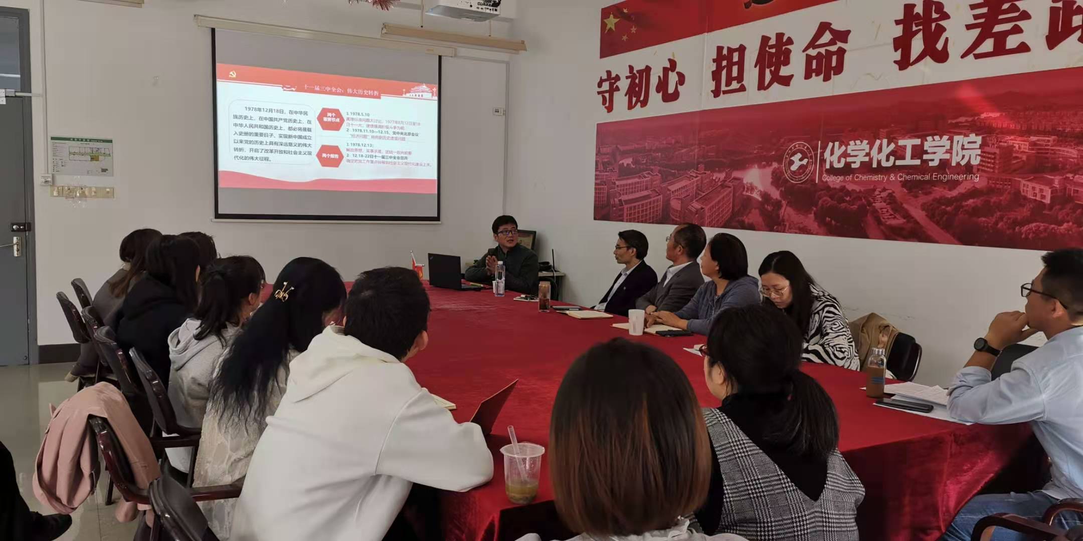 为贯彻落实学校、学院关于“四史”学习教育的部署和“一史一学”的要求,11月13日下午,化学化工学院在实训楼4403会议室举行了专题学习会,学校“四史”宣讲团成员马可老师作了“社会主义发展史视野下中国特色社会主义的实践探索”专题报告。学院党政班子成员、各党支部书记和党员代表参加会议,学院党委书记宋勤健主持会议。