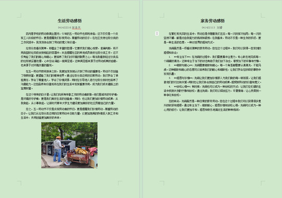 撰写劳动的思考与感悟,与他人交流和分享自己的劳动体验,是学院开展劳动教育的又一有效方式。学院鼓励学生用文字记录自己的劳动过程、分享自己的劳动感受、提升自己的劳动素养,使劳动教育理论与实践有机结合,巩固劳育成效。