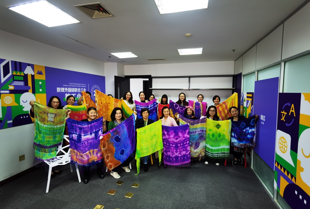 为了营造蓬勃向上的文化氛围,增强女教师的获得感、幸福感、归属感,数理与统计学院、外国语学院联合工会妇女小家特别策划组织了“扎染—感受自然的智慧”主题活动。11月16日下午,主题活动在行政楼1508顺利举行。本次活动内容新颖有趣,吸引了来自全校近30位女教师参加,校工会常务副主席柳如荣、副主席李霞、数理外国语联合党委书记钱慧敏参加指导活动开展。