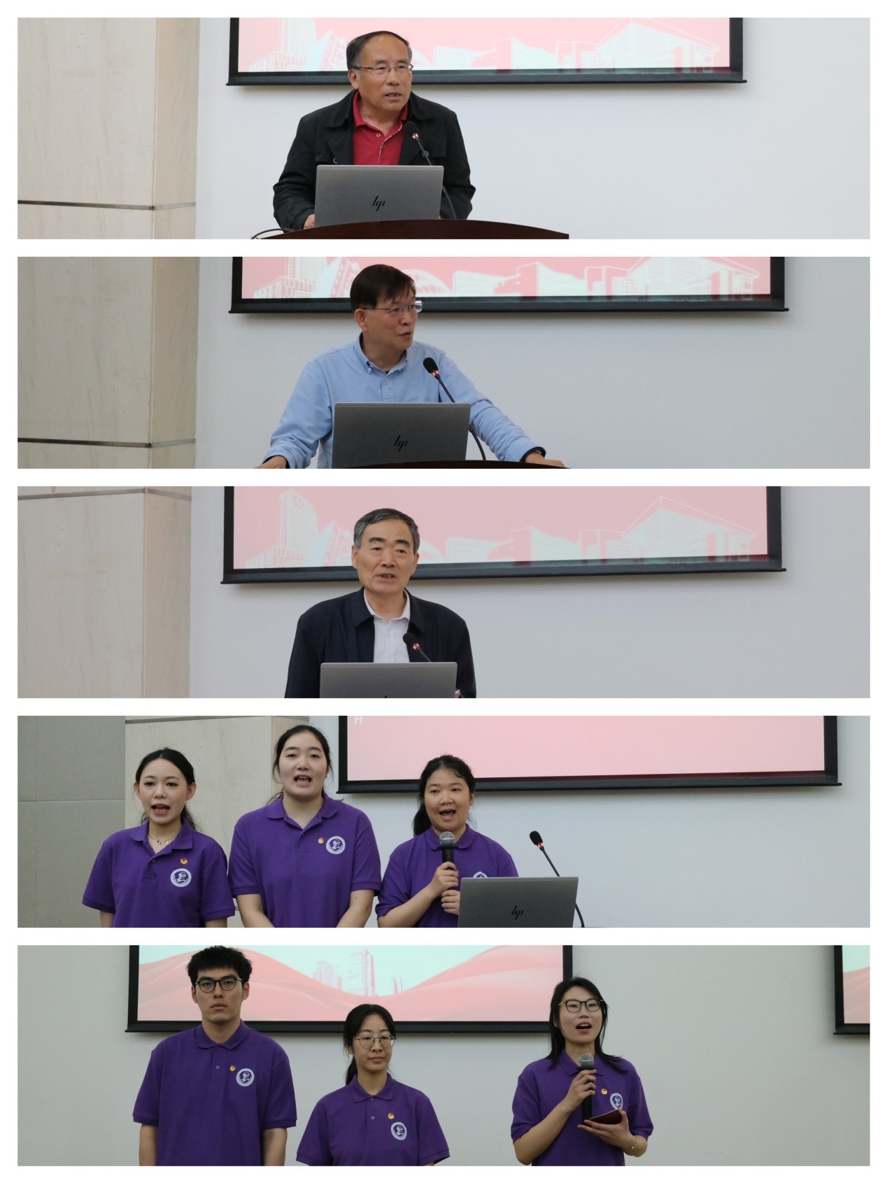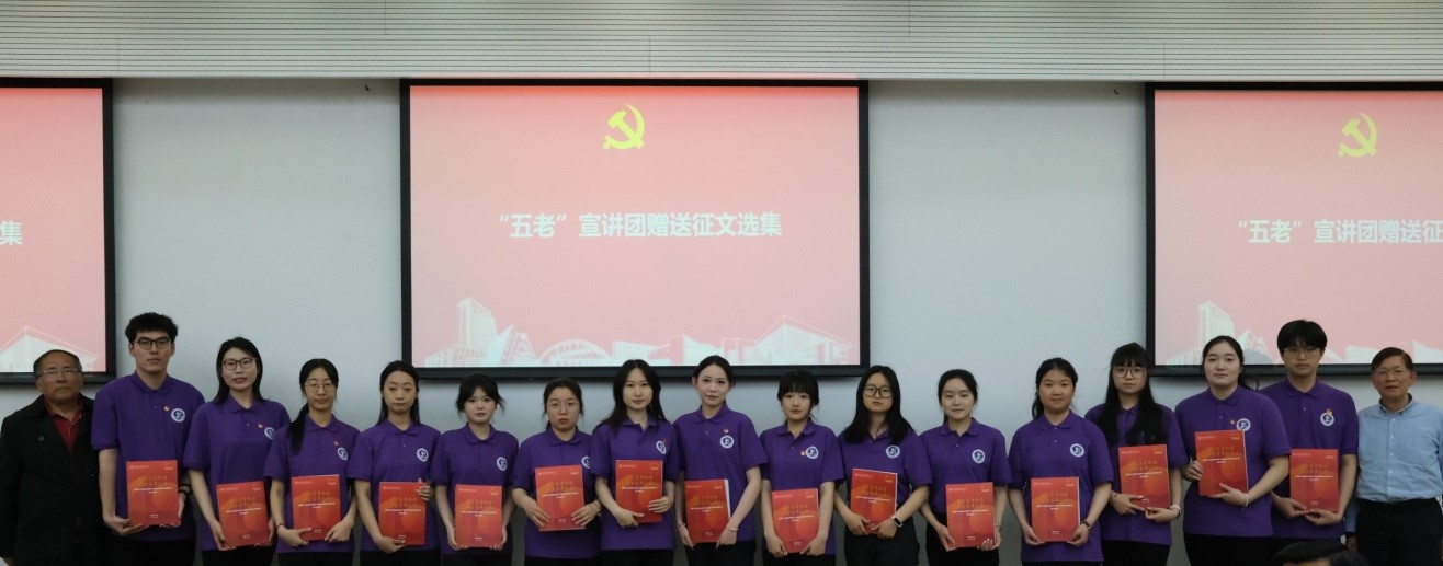 “五老”宣讲团代表夏斯云、田信灿为15位“青思青享”学生宣讲团团员赠送“盛赞百年”征文选集。