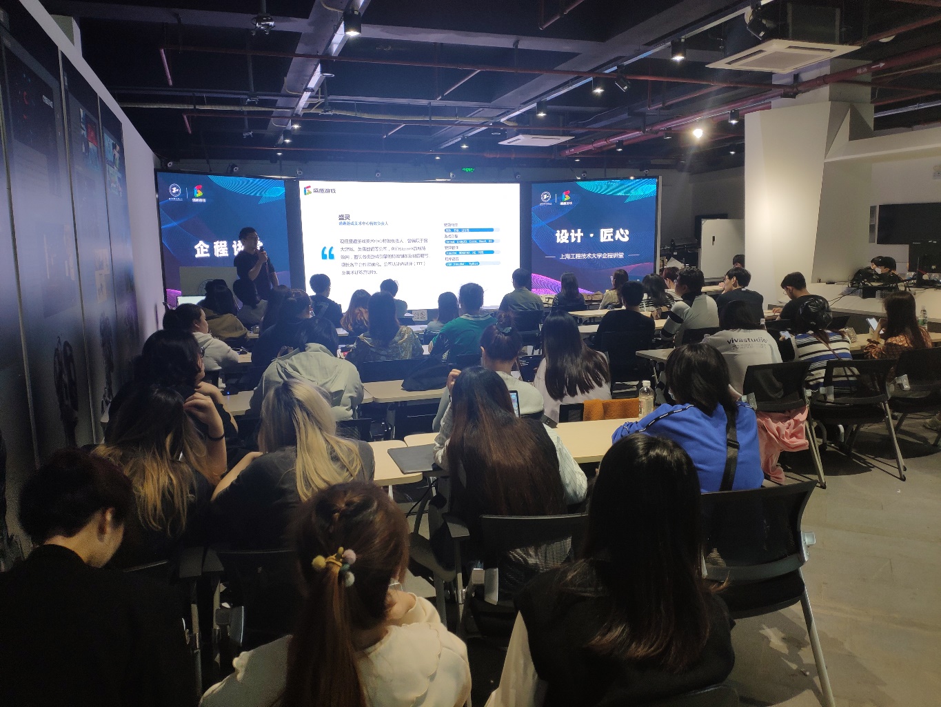 为进一步提升“三全育人”实效,加强“三全育人”内容供给,充分发挥校友在大学生成长成才中的作用,11月18日,中韩多媒体设计学院在学校虚拟现实中心举行“设计·匠心——企程讲堂”活动,本次主讲嘉宾为2005级毕业校友盛灵。