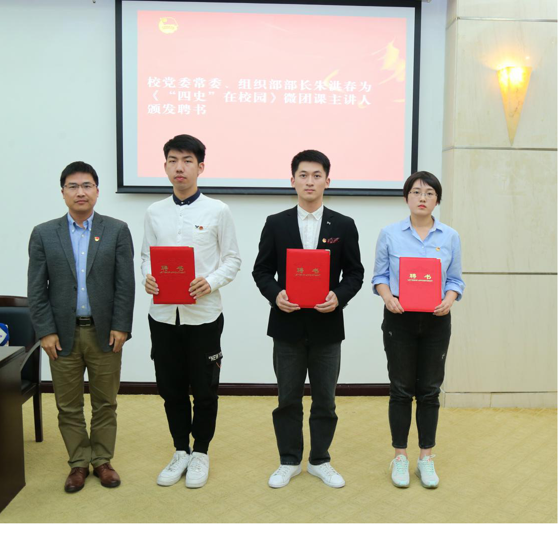 校党委常委、组织部部长朱洪春为首批《“四史”在校园》微团课主讲人吕圆、陈皓杰、张家俊颁发聘书。第一期推出的三集微团课,借助校史资源激发青年学生对“四史”的学习感悟,侧重于内容供给,分别从“大国交通”“人民城市建设”和“助力脱贫攻坚” 三个角度展示程园青年投身时代大潮的青春担当,不断强化青年学生对党的政治认同、思想认同、情感认同,筑牢青年学生听党话、跟党走的思想根基,努力成长为德智体美劳全面发展的社会主义建设者和接班人。