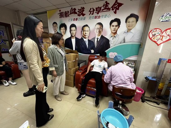 数理外国语联合党委书记钱慧敏、副书记梅元媛早早来到松江血站,现场看望、慰问参与献血的学生们,高度赞扬了学生们无私奉献的精神,耐心舒缓每一位学生的紧张情绪。学生工作办公室的辅导员还为每一位献血学生精心准备了暖心的食品,切实做好献血保障工作。