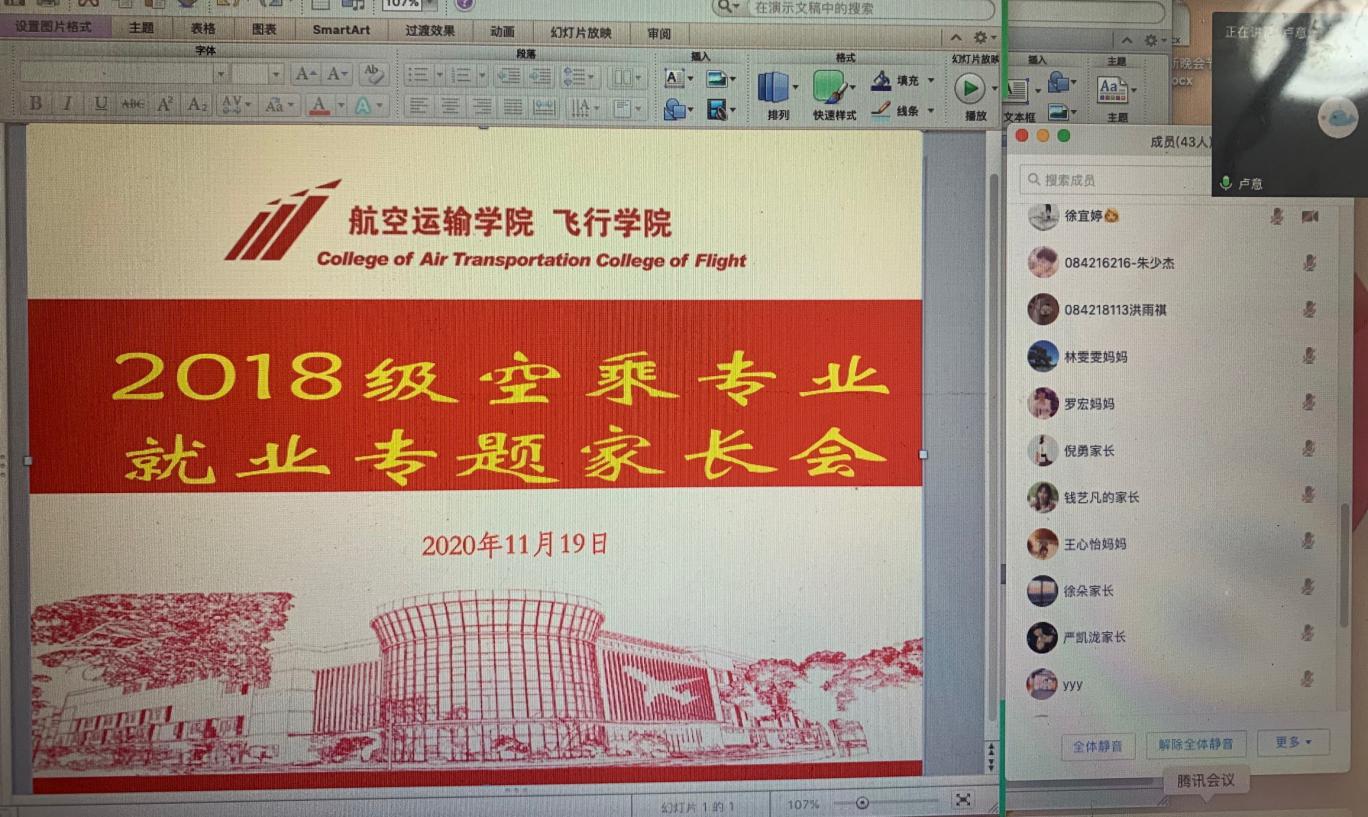11月18日上午,交通管理专业在腾讯会议召开毕业生线上家长会,会议由辅导员林小希老师主持。会议还进行了录播,便于不能出席的家长回看。会上分析了今年严峻的就业形势,特别是民航运输业的发展遇到了前所未有的困境,还介绍了考公考事业单位和地方基层项目的情况和注意事项,并进行了在线解答,林老师鼓励毕业生要多渠道多方向积极寻找工作。