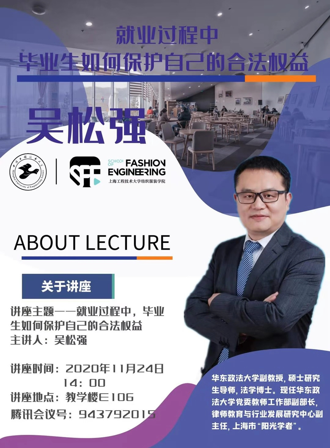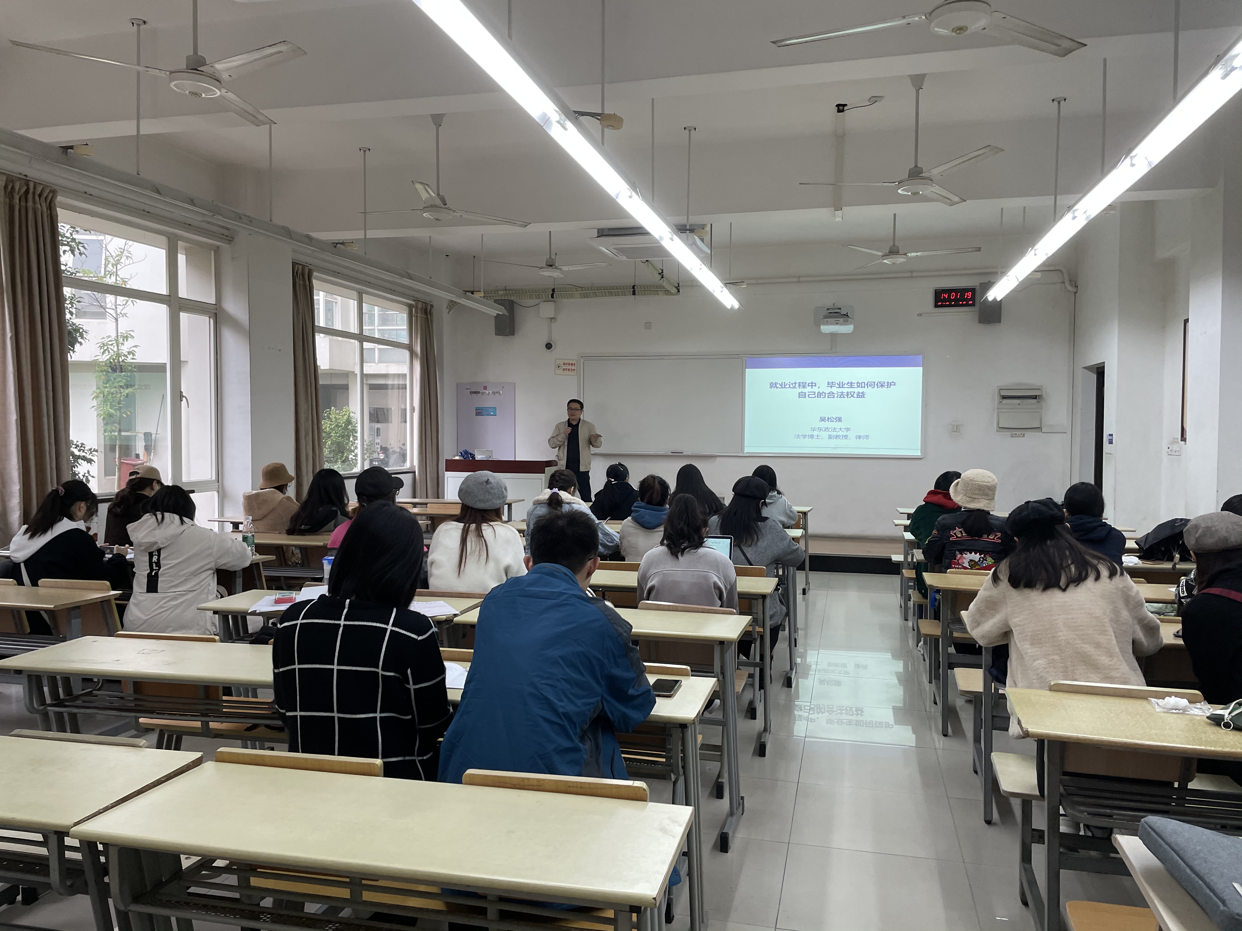 为保护毕业生在就业过程中的合法权益,11月24日下午,纺织服装学院特邀华东政法大学吴松强副教授在教学楼E106开展《就业过程中毕业生如何保护自己的合法权益》的讲座。纺织服装学院党委副书记谢志霞老师、就业辅导员、毕业班辅导员与毕业生出席讲座。