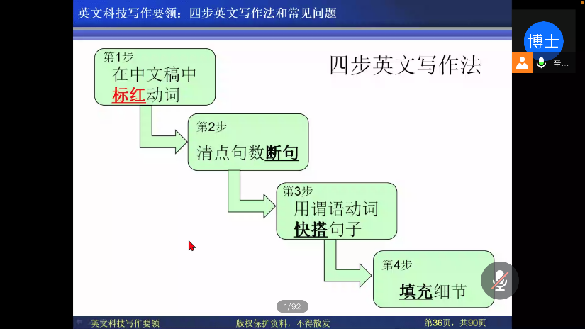 讲座最后,辛教授提出自己的四步英文写作法,并结合同学的论文现场修改帮助同学理解掌握方法。四步英文写作法中教授详细的为大家讲解每一步的要点以及注意事项,总的概括为四个注意:一要注意内容分段、写作风格、句子结构清晰、逻辑完整;二要注意用词妥当和时态语态正确;三要注意避免语法和语序错误;四要注意标点符号细节等规范。