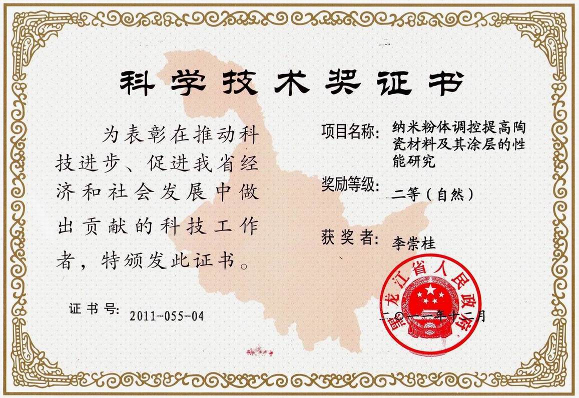 日前,材料工程学院青年教师李崇桂在攻读博士期间参与其导师的科研项目(并作为主要完成人)“纳米粉体调控提高陶瓷材料及其涂层的性能研究”获得2011年黑龙江省科学技术奖二等奖(自然科学类)。