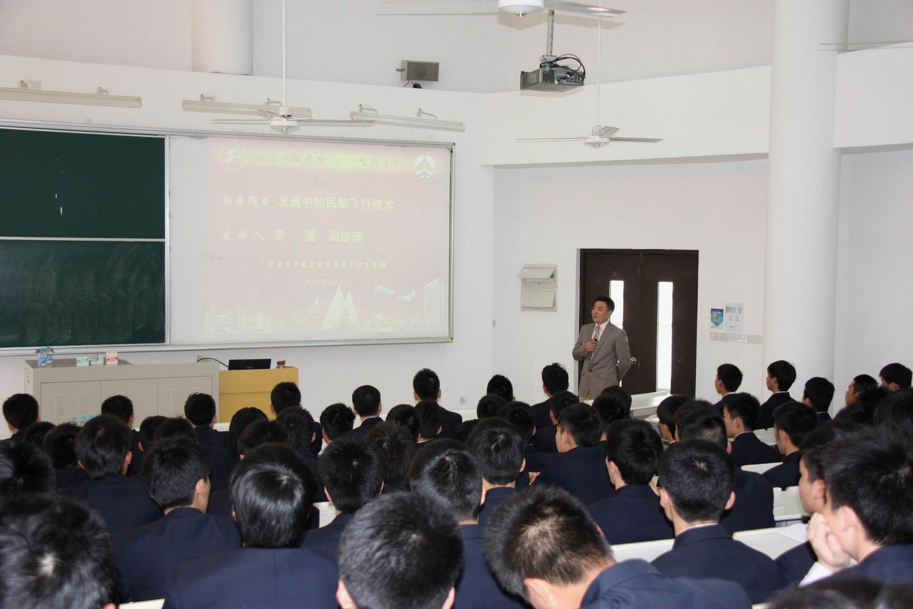 |  4月6日下午,飞行学院特邀中国东方航空股份有限公司飞管部副经理李湛来我校做题为“发展中的民航飞行技术”学术专题讲座。教学楼J302教室里座无虚席,飞行学院副院长匡江红副教授参加并主持了本次讲座,飞行技术系相关专业教师、飞行技术专业10、11级全体学生聆听了本次讲座。 李湛老师从航空历史切入主题,从热气球的升空讲到波音、空客飞机的研发历程,并就微下击暴流、雾霾天气、山地波、积冰等影响飞行安全的的天气情况向大家做细致讲解。最后,李湛老师对在座的所有未来的飞行员寄予殷切希望,希望大家能对飞行职业保持兴趣,更好地完成学习任务。最后,与李老师同行的学员代表向大家介绍了飞行员一天的生活工作休息情况,为大家描绘出未来工作的场景,引发了大家的极大兴趣。 李湛老师渊博的航空知识和诙谐幽默的讲座风格给大家留下了深刻的印象,会场掌声雷动,学生们积极提问,李湛老师就大家感兴趣的问题一一作答。本次讲座开阔了大家的视野,激发了大家的学习兴趣,取得了圆满成功。 |