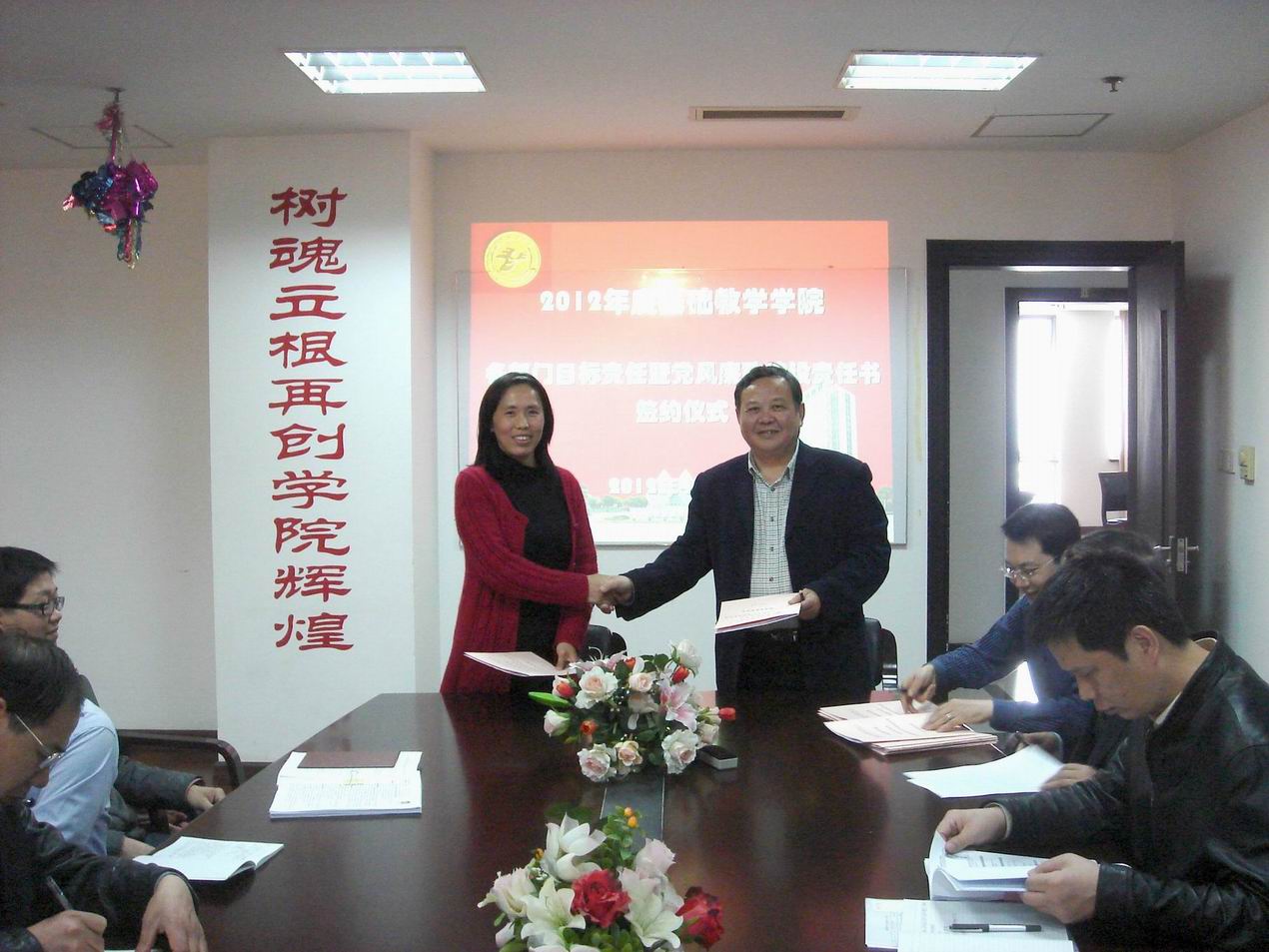 |  4月10日下午,基础教学学院在行政楼1308会议室,举行了2012年度目标责任书及党风廉政建设签约仪式。学院党政领导、各教学部主任和院办主任参加了此次签约仪式。学院与各教学部签订了2012年度目标责任、党风廉政建设责任书。 会上,学院各位领导分别就分管内容和指标分配作了简短的介绍。责任书中明确了各部门2012年度的工作任务、党风廉政建设等各项考核内容,并将考核指标细化到各教学部。签订学院目标责任考核书,使学院各教学部,每位教师明确2012年度的教学、科研任务,利于每位老师按照目标责任书的要求认真落实,从而推动学院教学、科研、管理、党建等工作等更好地开展,促进学院内涵发展。