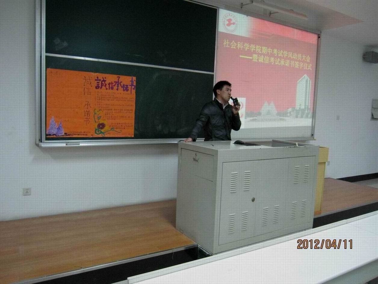 |  期中考试临近,为了督促学院学生抓紧复习,并有效的抑制和防范作弊现象,4月11日晚,社会科学学院分团委学生会心理健康协会在教学楼E106开展了“社会科学学院期中考试学风动员大会”。出席该活动的有社会科学学院辅导员吴超老师、社会科学学院分团委学生会心理健康协会所有干事以及学院11级的全体同学。 首先,主持人陆沁雨同学以“什么是学风”这一问题作为开场和同学们进行了互动交流,提醒同学们不诚信考试的后果和因此带来的心理上的负担。接着,吴超老师对同学们展开了以学风建设为中心的教育,他希望每位同学都能够提高自己的思想道德水平,加强个人素质与能力的培养,通过自己的努力,给自己、家人学校及社会一份满意的答卷,而非用小聪明和不正当手段获得高分。之后,主持人对活动做了总结,呼吁在座每位同学严于律己,做一名符合时代要求的优秀大学生。最后,同学们逐一在“诚信承诺书”上郑重地签下了自己的名字。 希望此次活动可以使同学们正确认识考试对评价自己的重要性,做一名诚信的大学生。大家表示可以多开展此类活动,让每一位学生从自身做起树立良好的学风学纪,并以此来影响周围的同学,最终可以打造诚信校园;让每一位学生端正学习态度,勤奋好学,并在老师的督促下不断进步,努力提高各方面的自身综合能力,成为一名优秀的大学生。
