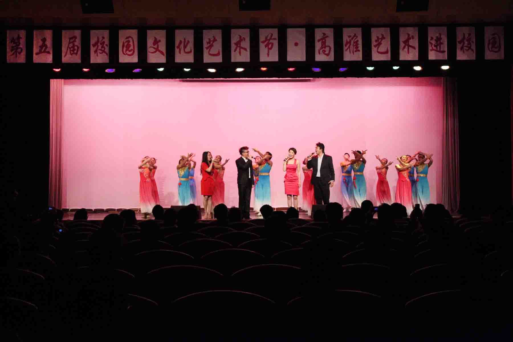 4月13日下午,在校学生处的大力支持下,高职学院“第五届校园文化艺术节之高雅艺术进校园”活动在师生活动中心四楼涵景堂隆重举行。本次活动由学生处主办,高职学院承办,力邀上海歌舞团来院进行表演,绚丽的舞台和青春的音乐,赢得了学院老师和同学们的广泛关注。 本次节目形式多样,内容别出心裁,充满新意。群舞《当代节奏》,表演者舞姿优美,繁华中又带有朴实的一面,生动形象地反应了当代生活的节奏;舞蹈《秦俑魂》、《秀色》让人身临其境,叹为观止;《王妃》、《老男孩》、《那片海》、《日不落》等热门流行歌曲让台下的同学和老师忘记平日的繁忙与劳累,完全沉浸在劲歌热舞之中。杂技表演《钻桶》让全场大呼惊喜与神奇。在《同一首歌》的歌声中,本次活动达到了高潮。 活动现场高潮迭起,精彩绝伦的表演让同学和老师们意犹未尽,本次活动作为高职学院第五届校园文化艺术节的活动之一,不仅丰富了师生的业余生活,还加强了校园的文化建设,为学院更好更美的明天注入了青春活力。