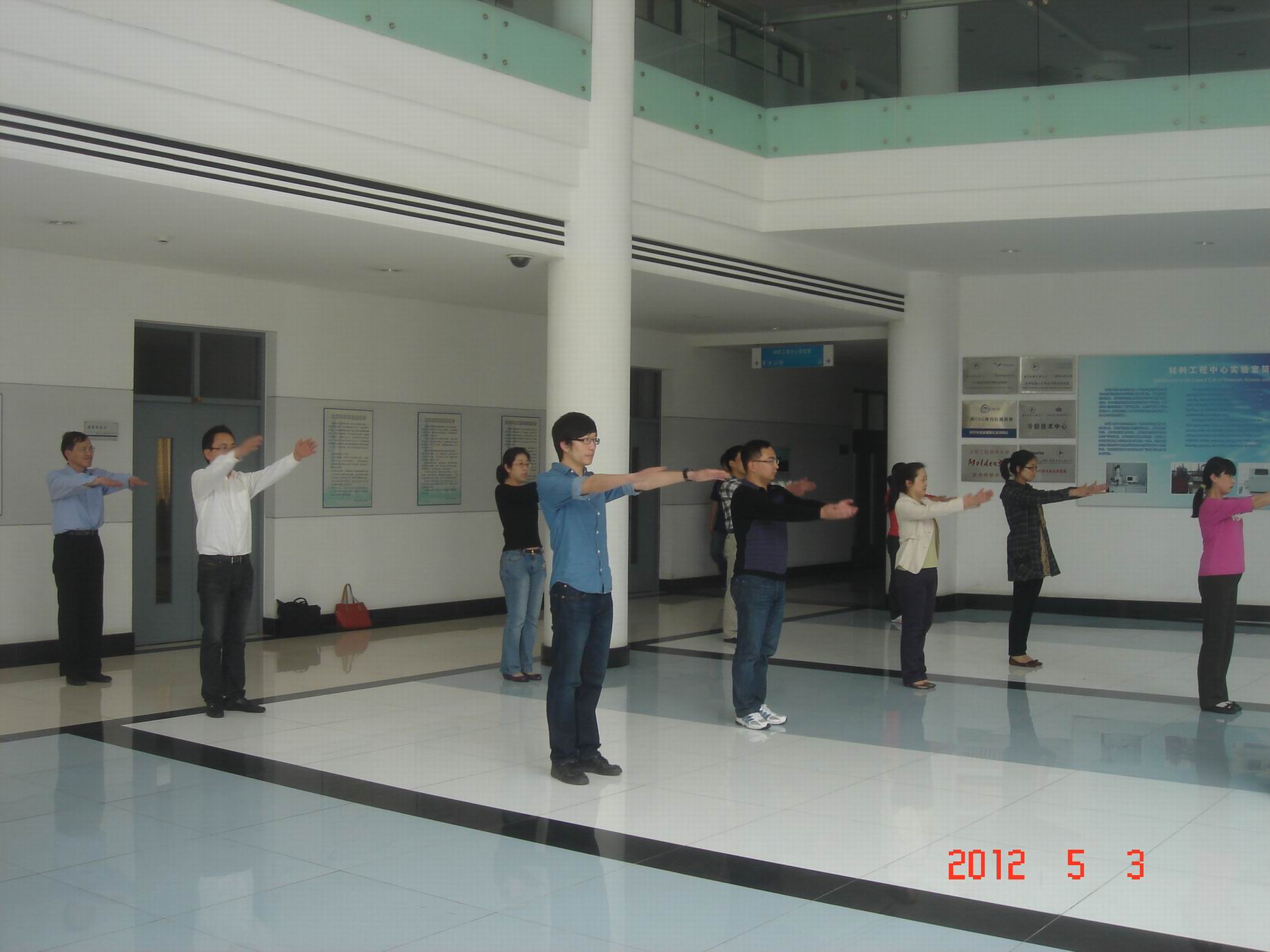 近日,为迎接下月中旬召开的校运动会广播操比赛,材料工程学院积极组织教工在实训三号楼大厅进行第八套广播体操练习,学院总支书记徐国祥、工会主席王慧萍等12人参加了第一次训练。在音乐声中大家认真地完成每一个动作,并表示要借此次比赛的机会,今后多参加运动,提高身体素质,以更好地精力投入到工作和学习中去。